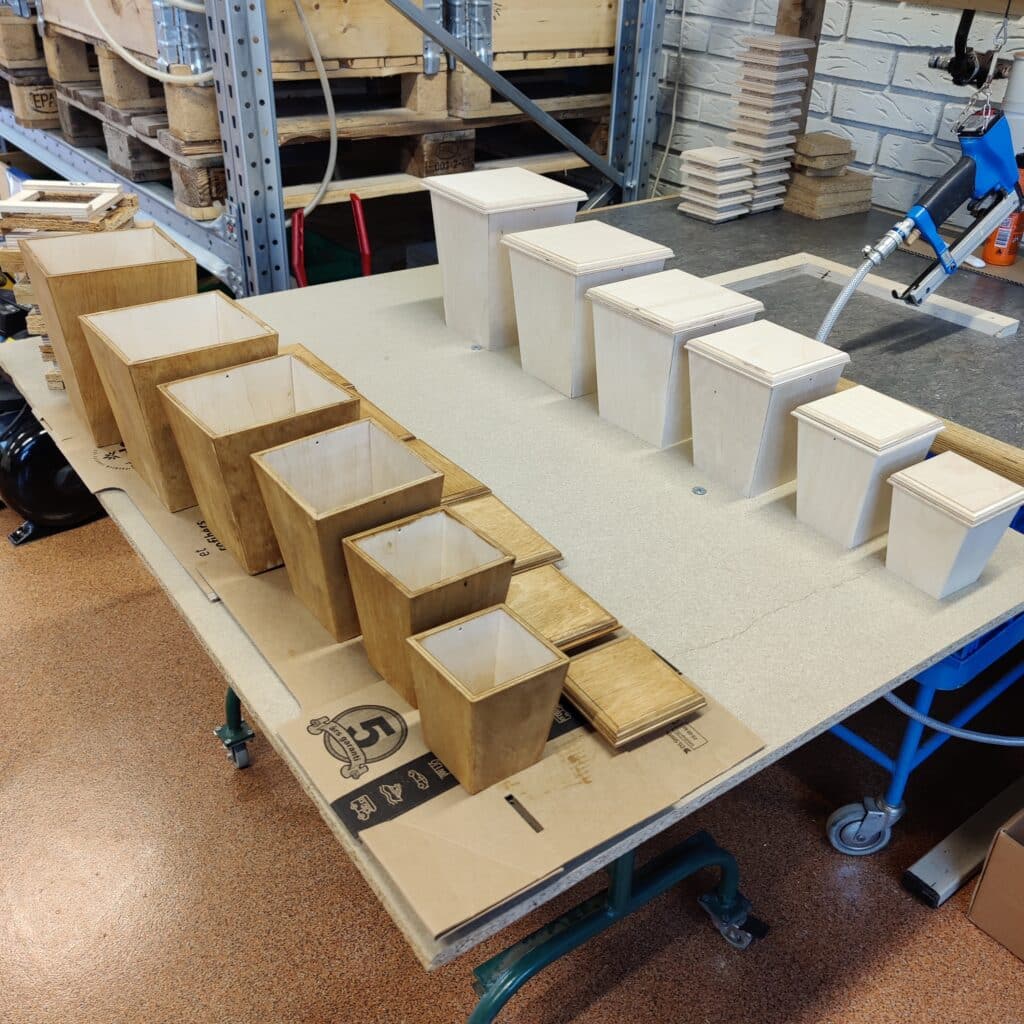 Ett gäng nytillverkade urnor redo för slipning för att få runda och fina hörn.