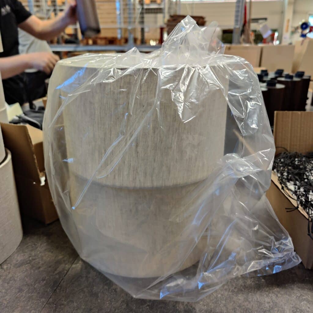 Här hjälper vi en kund att byta Ean-kod på några tusen lampskärmar, för att sedan packa ner dem i samma kartonger och skicka tillbaka dem till kunden.